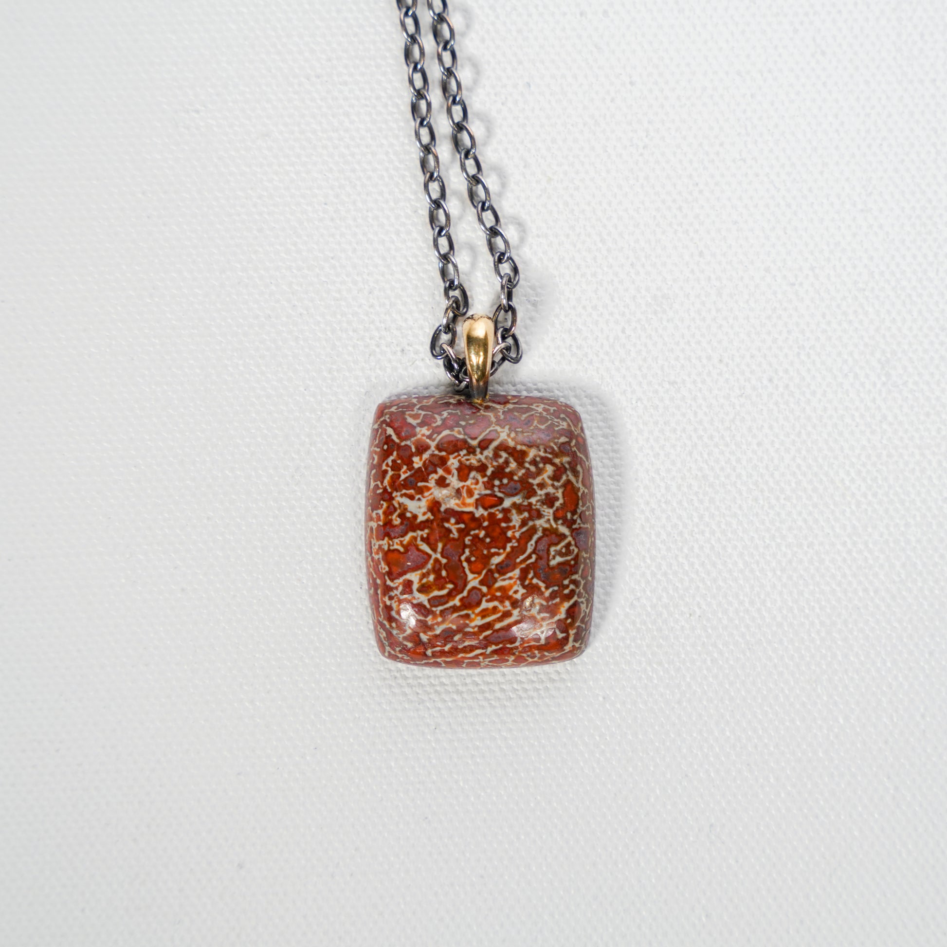 Fossilized dinosaur bone agate, 18 karat yellow gold, and oxidized sterling silver.